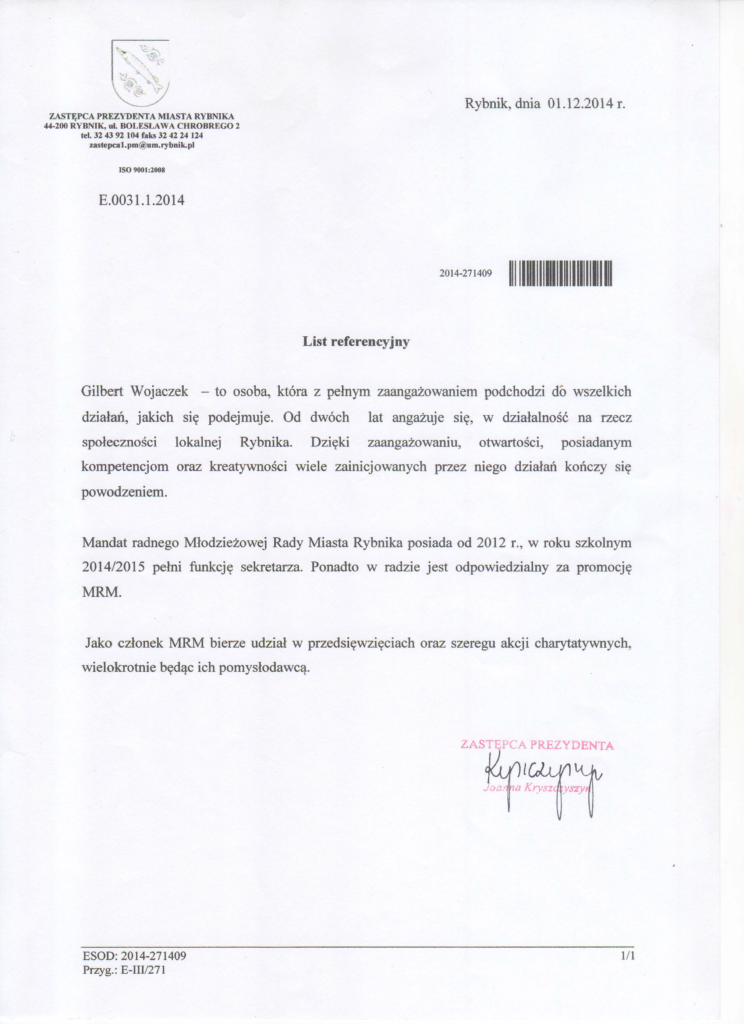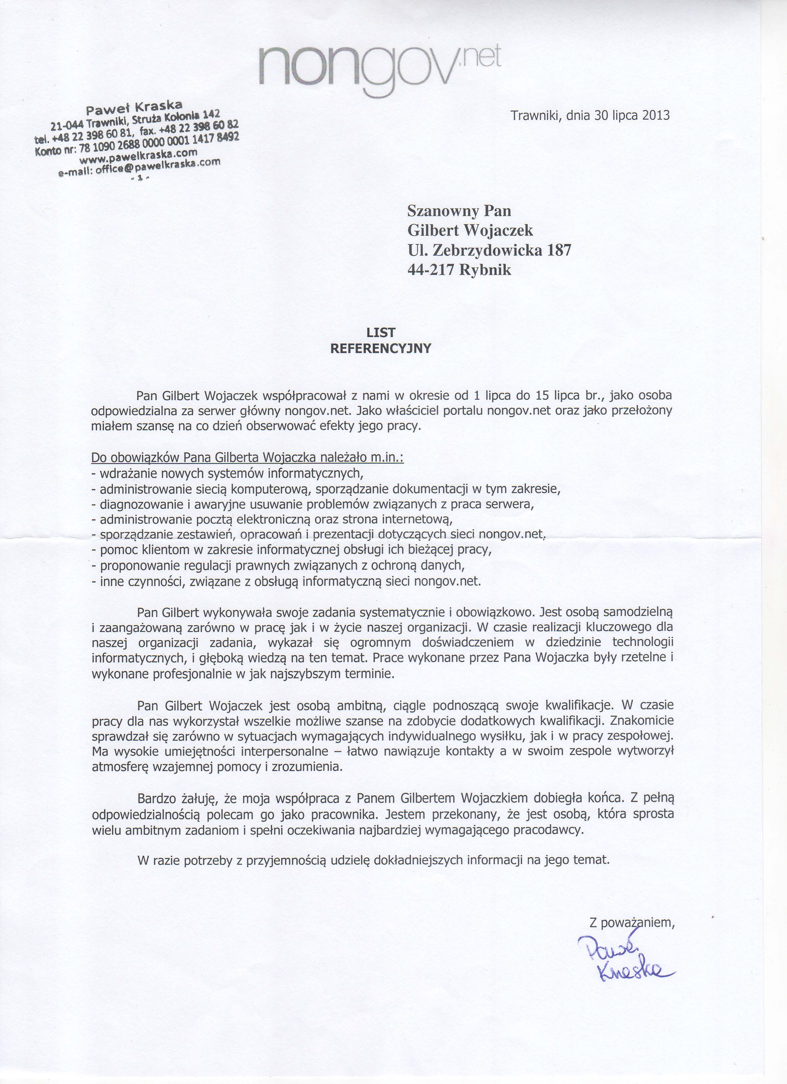 Bardzo żałuję, że moja współpraca z Panem Gilbertem Wojaczkiem dobiegłakońca. Z pełną odpowiedzialnością polecam go jako pracownika. Jestemprzekonany, że jest osobą, która sprosta wielu ambitnym zadaniom i spełnioczekiwania najbardziej wymagającego pracodawcy.